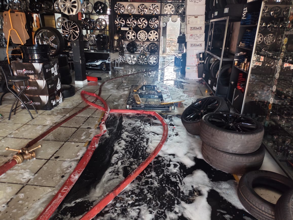 O local se tratava de um estabelecimento comercial de rodas e pneus automotivos, o qual incêndio estava concentrado aos fundos da loja, com chamas de grandes proporções e com risco de propagação para residências vizinhas.